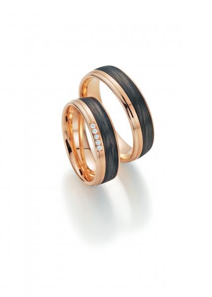Diese Ringe sorgen für Aufsehen. Futuristische und einzigartige Ringe in 585 Rotgold und Carbon. Carbon ist extrem leicht, so dass auch stärkere, breite Ringe ein erstaunlich niedriges Gewicht aufweisen. Das Material ist äußerst beständig gegen Chemikalien und Temperaturschwankungen und zeigt beim Tragen zudem kaum Abnutzungserscheinungen. 5 Brillanten 0,03 ct. TW/SI. Breite 6,00 mm.