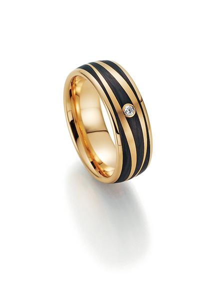 Diese Ringe sorgen für Aufsehen. Futuristische und einzigartige Ringe in 585 Apricotgold und Carbon. Carbon ist extrem leicht, so dass auch stärkere, breite Ringe ein erstaunlich niedriges Gewicht aufweisen. Das Material ist äußerst beständig gegen Chemikalien und Temperaturschwankungen und zeigt beim Tragen zudem kaum Abnutzungserscheinungen. 1 Brillant 0,02 ct. TW/SI. Breite 7,00 mm. Auch als Paar möglich.