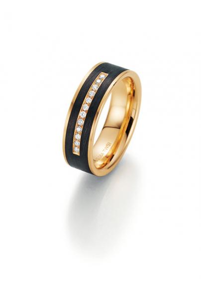 Diese Ringe sorgen für Aufsehen. Futuristische und einzigartige Ringe in 585 Apricotgold und Carbon. Carbon ist extrem leicht, so dass auch stärkere, breite Ringe ein erstaunlich niedriges Gewicht aufweisen. Das Material ist äußerst beständig gegen Chemikalien und Temperaturschwankungen und zeigt beim Tragen zudem kaum Abnutzungserscheinungen. 12 Brillanten 0,84 ct. TW/SI. Breite 6,00 mm. Auch als Paar möglich.