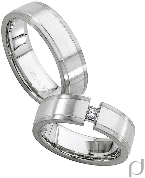 Kaiserliche Trauringe in 950 Platin-750 Weissgold seidenmatt aus der 150 Jahre alten. Wie beim Fotoshooting, jedes Detail muss stimmen. 1 wertvoller Diamant - Prinzess cut 0,14 ct. TW/VS. Breite 6,00 mm. Aus der 150 Jahre alten Manufaktur Furrer Jacot aus der Schweiz. Am Standort Schaffhausen werden reizende Verlobungsringe und gemusterte Trauringe, sowie exellente Brillantstücke individuell gefertigt. Wählen Sie eine Gravur von den außergewöhnlichen Schriftarten aus.
