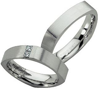 Begeisternde massive Trauringe in 950 Platin seidenmatt. So wie der Anzug des Bräutigam oder das Kleid der Braut, müssen die Trauringe sorgsam ausgesucht sein. 3 Diamanten - Prinzess cut zusammen 0,14 ct. TW/VS. Breite 4,50 mm. Eckige Ringform. Aus der 150 Jahre alten Manufaktur Furrer Jacot aus der Schweiz. Am Standort Schaffhausen werden reizende Verlobungsringe und gemusterte Trauringe individuell gefertigt. Wählen Sie eine Gravur von den außergewöhnlichen Schriftarten aus.