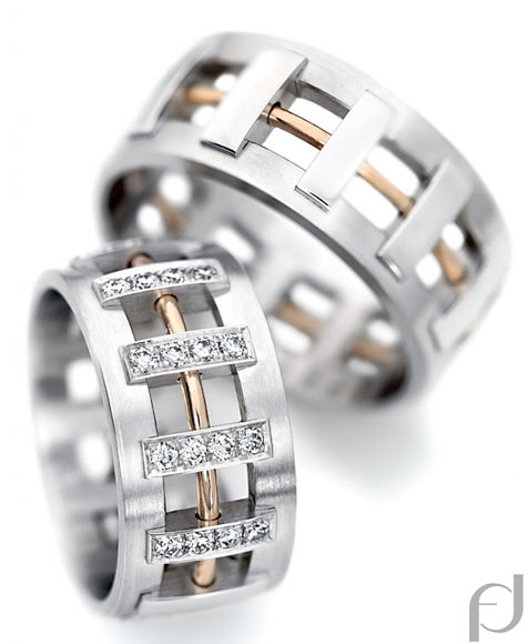 Manufaktur Furrer Jacot - Schweiz. Edle Trauringe in 950 Platin seidenmatt - 750 Rotgold poliert aus der 150 Jahre alten Manufaktur Furrer Jacot aus der Schweiz. Ausgefallene Traumringe. 48 Brillanten zusammen 0,72 ct. TW/VS. Preis ist von der Größe abhängig. Auch in halb ausgefasst möglich - siehe Steinbesatz. Breite 10,00 mm.