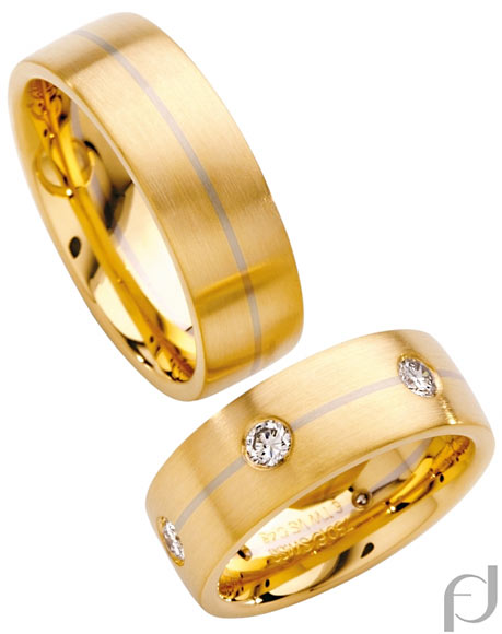 Kaiserliche Trauringe in 950 Platin-750 Gelbgold seidenmatt. Wie beim Fotoshooting, jedes Detail muss stimmen. 6 fabelhafte Brillanten zusammen 0,48 ct. TW/VS. Breite 7,00 mm. Aus der 150 Jahre alten Manufaktur Furrer Jacot aus der Schweiz. Am Standort Schaffhausen werden reizende Verlobungsringe und gemusterte Trauringe, sowie exellente Brillantstücke individuell gefertigt. Wählen Sie eine Gravur von den außergewöhnlichen Schriftarten aus.