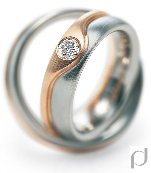 Kaiserliche Trauringe in 950 Platin-750 Rotgold seidenmatt. Wie beim Fotoshooting, jedes Detail muss stimmen. Damenring 1 liebgewonnener Brillant 0,20 ct. TW/VS. In jedem Ring ist ein Innenbrillant 0,01 ct. TW/VS gefasst. Damenringbreite 6,0 mm. Herrenringbreite 5,5 mm. Am Standort Schaffhausen werden reizende Verlobungsringe und gemusterte Trauringe, sowie exellente Brillantstücke individuell gefertigt. Wählen Sie eine Gravur von den außergewöhnlichen Schriftarten aus.