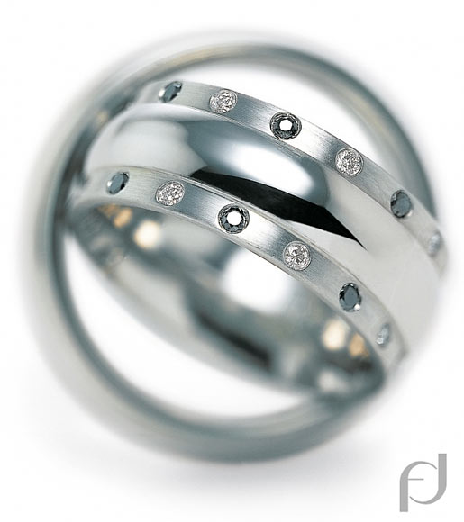 Begeisternde Trauringe in 950 Platin seidenmatt und poliert. So wie der Anzug des Bräutigam oder das Kleid der Braut, müssen die Trauringe sorgsam ausgesucht sein. Damenring 32 wertvolle Brillanten 0,378 ct. TW/VS. 16 weisse Brillanten, 16 schwarze Brillanten. Herrenring 1 Brillant 0,01 ct. TW/VS. In jedem Ring ist ein Innenbrillant 0,01 ct. TW/VS gefasst. Breite 6,00 mm. Aus der 150 Jahre alten Manufaktur Furrer Jacot aus der Schweiz. Am Standort Schaffhausen werden reizende Verlobungsringe und gemusterte Trauringe individuell gefertigt. Wählen Sie eine Gravur von den außergewöhnlichen Schriftarten aus.