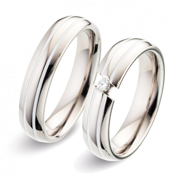 Titan Factory. Produktion aus Schwäbisch Gmünd - Deutschland. Titan rostet nicht und ist absolut allergineutral und hautfreundlich. Und absolut Nickelfrei. Trauringe aus Titan-Keramikeinlage in weiß, auch in schwarz machbar. 1 Brillant 0,05 ct. W/SI. Breite 5,00 mm.