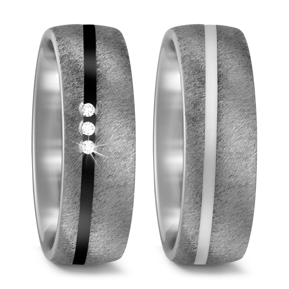 Titan Factory. Produktion aus Schwäbisch Gmünd - Deutschland. Titan rostet nicht und ist absolut allergineutral und hautfreundlich. Und absolut Nickelfrei. Trauringe aus Titan-Keramikeinlage in weiß, auch in schwarz machbar. 3 Brillanten 0,03 ct. W/SI. Breite 7,50 mm.