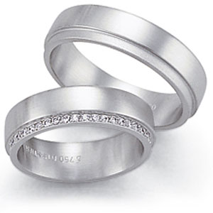 Manufaktur Fischer - Deutschland. Edle Trauringe in 585 Weissgold seidenmatt und sandmatt aus der Pforzheimer Manufaktur. Eine Firma mit Tradition und gutem Preis-Leistungsverhältnis. Diverse Brillanten zusammen 0,154 ct. TW/SI. Halb ausgefasst ; auch in ganz ausgefasst machbar. Breite 6,00 mm.