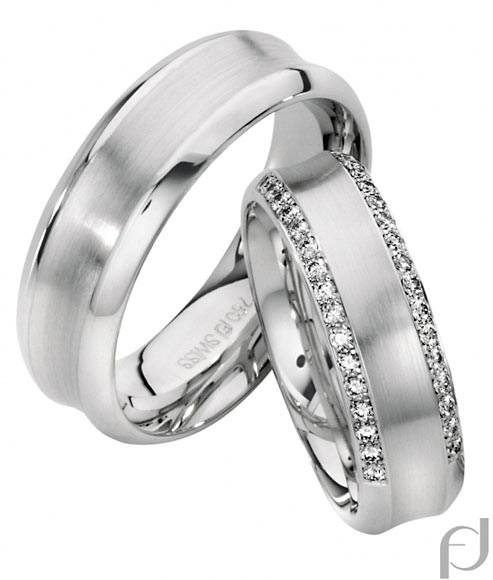Außergewöhnliche konkave Memoires-Trauringe in 750 Weißgold seidenmatt und poliert. So wie die Frage welcher Stoff oder welcher Schnitt das Brautkleid haben soll, so auch die Beschaffenheit der Trauringe in Form, Farbe und Profil. 30 exklusive Brillanten zusammen 0,24 ct. TW/VS. 1/3 ausgefasst. Breite Damenring 6,00 mm. Breite Herrenring 7,00 mm. Aus der 150 Jahre alten Manufaktur Furrer Jacot aus der Schweiz. Am Standort Schaffhausen werden reizende Verlobungsringe und gemusterte Trauringe individuell gefertigt.
