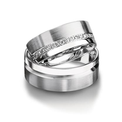 Manufaktur Furrer Jacot - Schweiz. Edle Trauringe in 750 Weissgold poliert und seidenmatt aus der 150 Jahre alten Manufaktur Furrer Jacot aus der Schweiz. 38 Brillanten zusammen 0,38 ct. F-G/VS. Breite 7,50 mm.