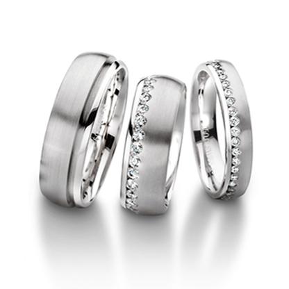 Manufaktur Furrer Jacot - Schweiz. Edle Trauringe in 750 Weissgold seidenmatt und poliert aus der 150 Jahre alten Manufaktur Furrer Jacot aus der Schweiz. 29 Brillanten zusammen 0,725 ct. F-G/VS. Breite 6,50 mm.