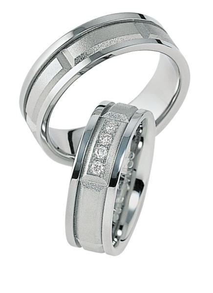 Gegossene Trauringe aus einem ganzen Stück gestanzt in 750 Weißgold sandmatt und poliert. 4 entzöckende Brillanten zusammen 0,08 ct. TW/VS. Breite 6,50 mm. Am Standort Schaffhausen werden reizende Verlobungsringe und gemusterte Trauringe individuell gefertigt. Wählen Sie eine Gravur von den außergewöhnlichen Schriftarten aus.