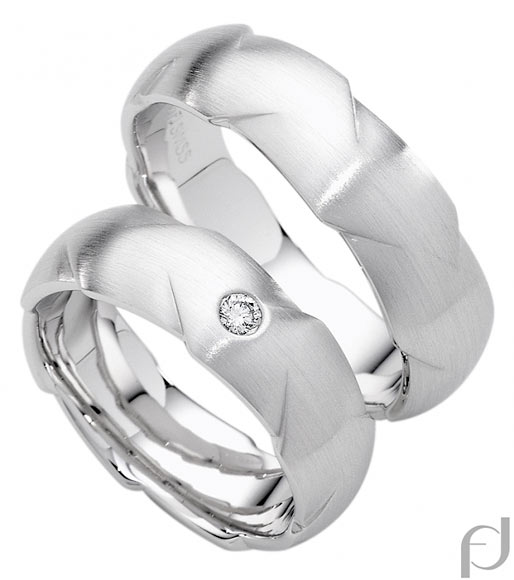 Gegossene Trauringe aus einem ganzen Stück gestanzt in 750 Weißgold seidenmatt. 1 wunderbarer Brillant 0,04 ct. TW/VS. Breite 6,5 mm. Aus der 150 Jahre alten Manufaktur Furrer Jacot aus der Schweiz. Am Standort Schaffhausen werden reizende Verlobungsringe und gemusterte Trauringe individuell gefertigt. Wählen Sie eine Gravur von den außergewöhnlichen Schriftarten aus.