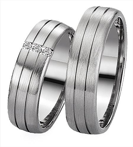 Unrhodiniertes Weßgold, welches farbtreu und grau ist. Firma Gettmann aus Deutschland in Pforzheim. Hochwertige Trauringkollektion, was zu Ihrer Hochzeit dazu beitragen kann. Edle Trauringe mit Fugen in 585 Graugold seidenmatt. 3 Brillanten zusammen 0,075 ct. TW/SI. Breite 6,00 mm. Die Gravur inklusive.
