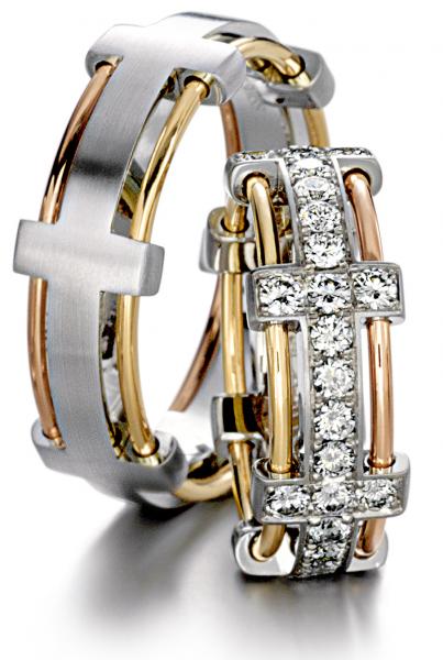 Manufaktur Furrer Jacot - Schweiz. Edle Trauringe in 750 Weiss/Rot/Gelbgold seidenmatt und poliert aus der 150 Jahre alten Manufaktur Furrer Jacot aus der Schweiz. 42 Brillanten zusammen 1,68 ct. TW/VS. Breite 8,50 mm. Preis ist von der Größe abhängig.