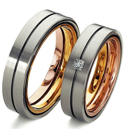 Schmeichelnde Trauringe im bengalisches Feuer in 750 Weißgold seidenmatt+750 Rotgold-750 Gelbgold poliert. 1 edler Dimant - Prinzess 0,07ct. TW/VS. Breite 5,50 mm. Kollektion Feeling! Aus der 150 Jahre alten Manufaktur Furrer Jacot aus der Schweiz. Am Standort Schaffhausen werden reizende Verlobungsringe und gemusterte Trauringe individuell gefertigt. Wählen Sie eine Gravur von den außergewöhnlichen Schriftarten aus.