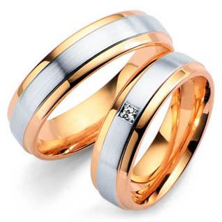 Manufaktur Fischer - Deutschland. Edle und wunderschöne Trauringe in 333 Weissgold seidenmatt - Apricotgold poliert aus der Pforzheimer Manufaktur. Eine Firma mit Tradition und gutem Preis-Leistungsverhältnis. 1 Brillant 0,02 ct. TW/SI. Breite 6,00 mm.