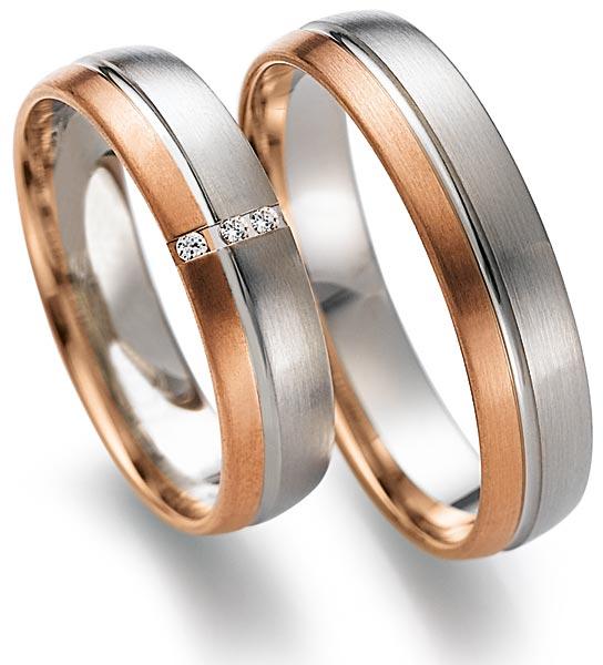 Manufaktur Gerstner - Deutschland. Firmengründung 1862, seit 6 Generationen in Familienbesitz, gehört zu den ältesten und erfahrensten Trauringherstellern in Europa. Edle Trauringe in 585 Weiss-Rotgold seidenmatt. 3 Brillanten zusammen 0,024 ct. TW/SI. Breite 5,00 mm.
