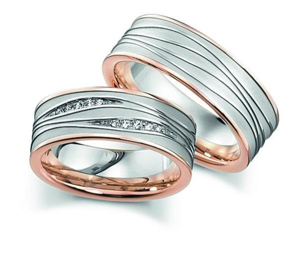 Manufaktur Fischer - Deutschland. Edle Trauringe in 585 Weissgold / Rotgold seidenmatt und poliert aus der Pforzheimer Manufaktur. Eine Firma mit Tradition und gutem Preis-Leistungsverhältnis. Mehrere Brillanten zusammen 0,06 ct. TW/SI. Breite 7,50 mm.