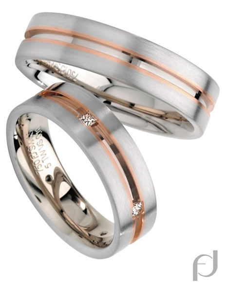 Mit den glamourösen Trauringe den perfekten Heiratsantrag stelllen, bei Sonne, Meer und Palmen in 750 Weissgold poliert und seidenmatt-Rotgold seidenmatt. 5 ganz hervorragende Prinzess - Diamanten zusammen 0,10 ct. TW/VS. Breite 5,5 mm.