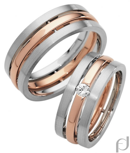 Mit den glamourösen Trauringe den perfekten Heiratsantrag stelllen, bei Sonne, Meer und Palmen in 750 Weissgold seidenmatt-Rotgold poliert. 1 schön gefasster Brillant 0,10 ct. TW/VS. Breite 7,5 mm. Aus der 150 Jahre alten Manufaktur Furrer Jacot aus der Schweiz. Am Standort Schaffhausen werden reizende Verlobungsringe und gemusterte Trauringe individuell gefertigt. Wählen Sie eine Gravur von den außergewöhnlichen Schriftarten aus.