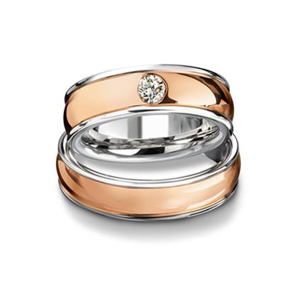 Mit den glamourösen Trauringe den perfekten Heiratsantrag stelllen, bei Sonne, Meer und Palmen in 750 Weiss-Rotgold poliert. Damenring 1 absolut hübscher großer Brillant 0,20 ct. TW/VS. In jedem Ring ist ein Innenbrillant 0,01 ct. TW/VS gefasst. Damenringbreite 6,5 mm. Herrenringbreite 5,5 mm. Aus der 150 Jahre alten Manufaktur Furrer Jacot aus der Schweiz. Am Standort Schaffhausen werden reizende Verlobungsringe und gemusterte Trauringe individuell gefertigt. Wählen Sie eine Gravur von den außergewöhnlichen Schriftarten aus